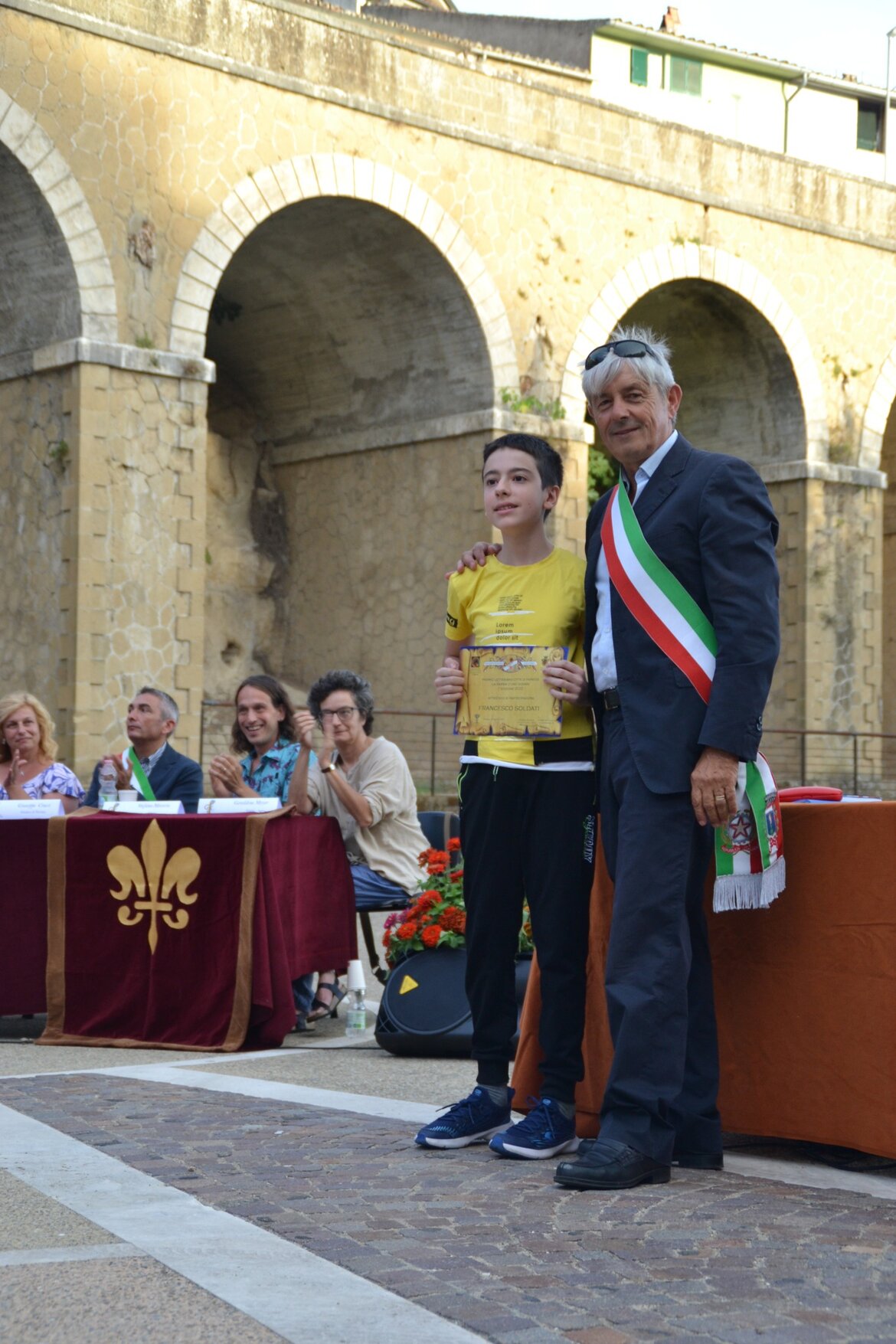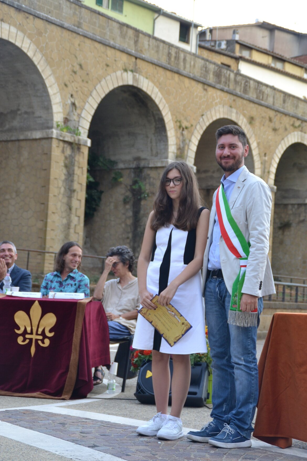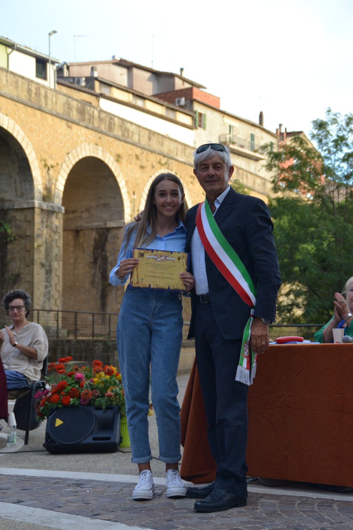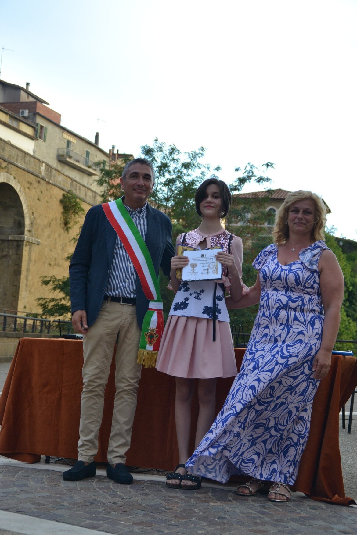 1° LIDIA MARSILI, per l'opera "Il palloncino rosso". Hanno premiato con la Farnia d'Oro il dott. Marco Corizi, Presidente dell'Associazione ed il dott. Giuseppe Ciucci, Sindaco di Farnese.